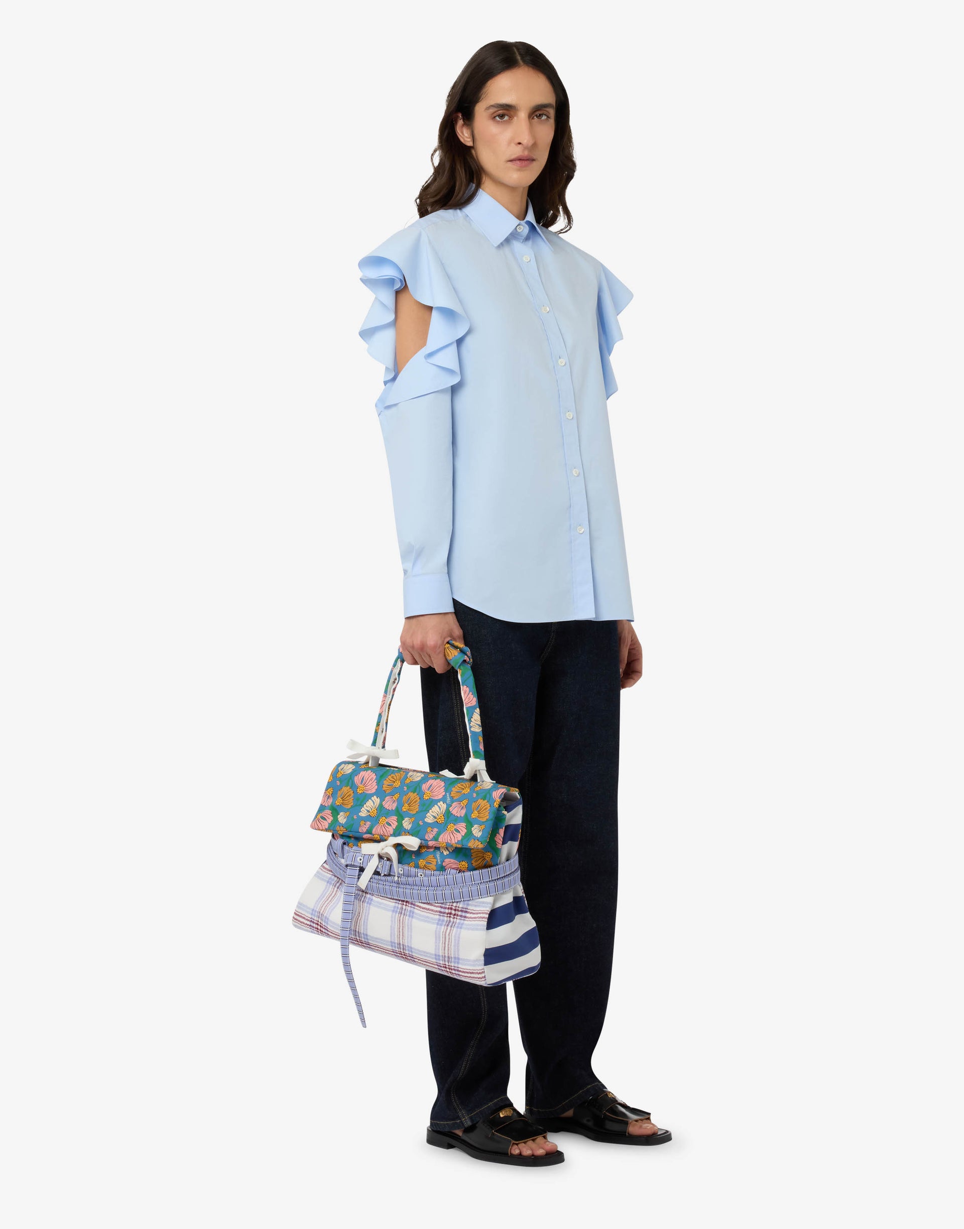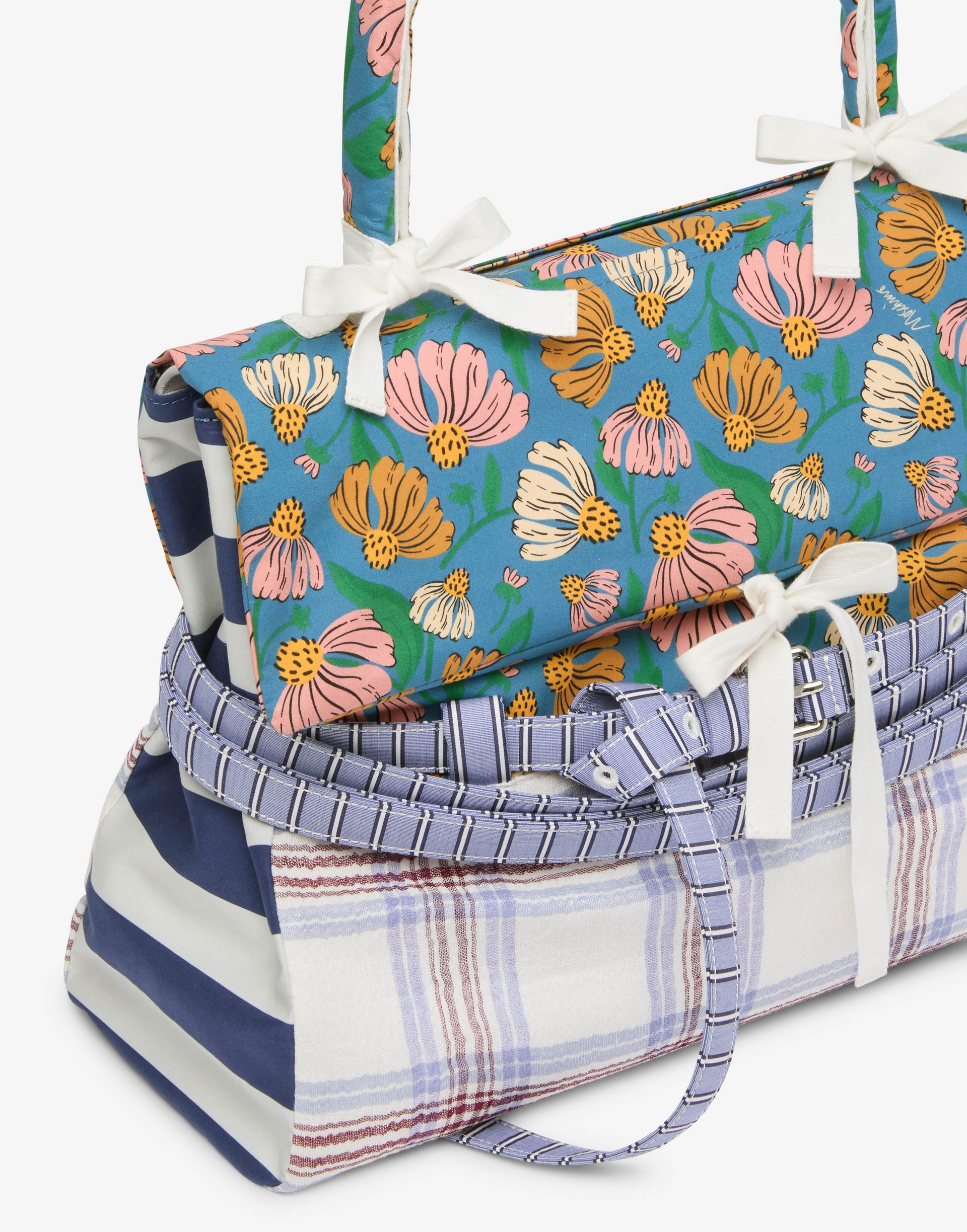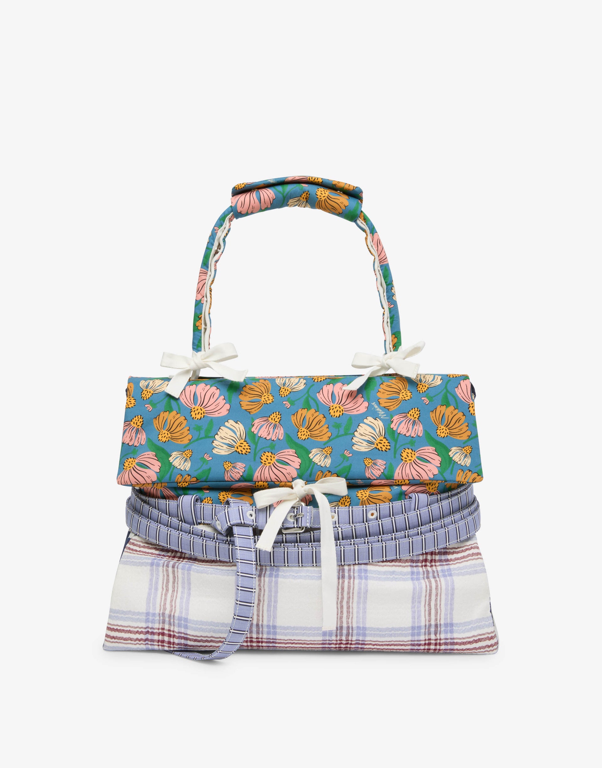 La colección Primavera/Verano 2026 presenta el bolso de mano mediano en napa, enriquecido con una funda de patchwork extraíble en mezcla de algodón con estampado en contraste. El asa está recubierta por un forro extraíble mediante botones automáticos. La característica distintiva es el cinturón decorativo, completamente extraíble, que rodea el cuerpo del bolso.