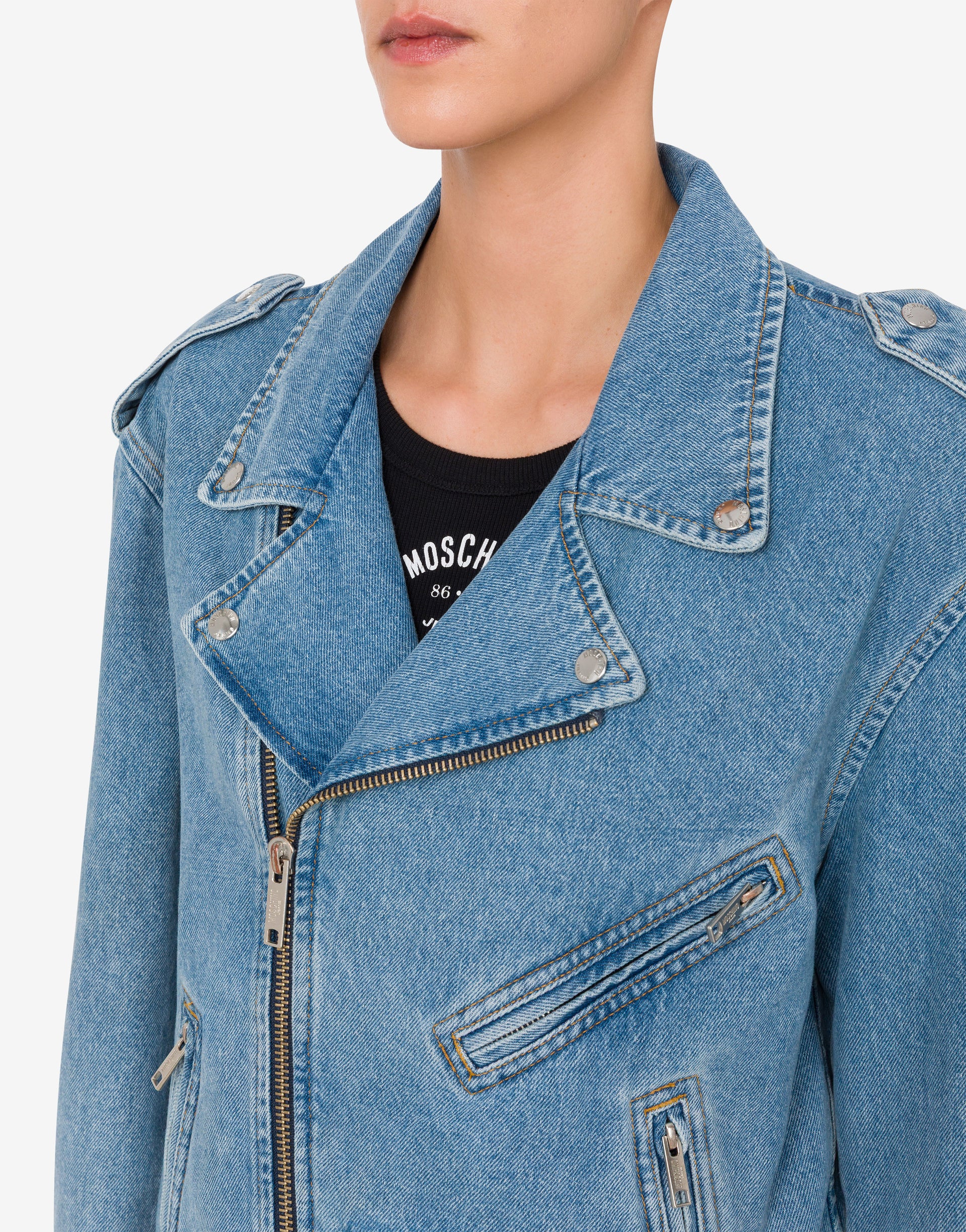 La colección Primavera/Verano 2026 presenta la chaqueta motera de denim de algodón con bolsillos con cremallera, parche con el logotipo aplicado en la espalda y detalles metálicos.