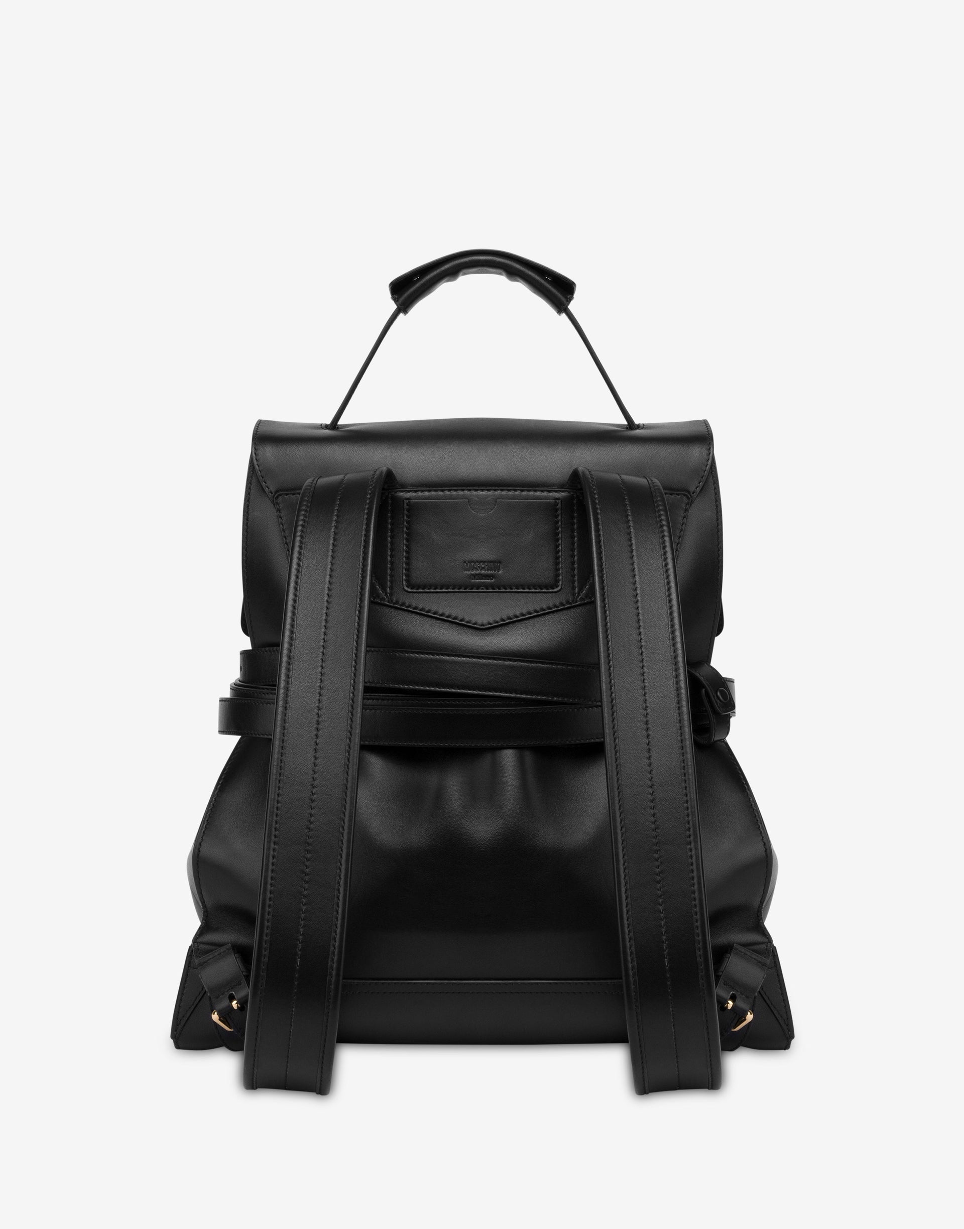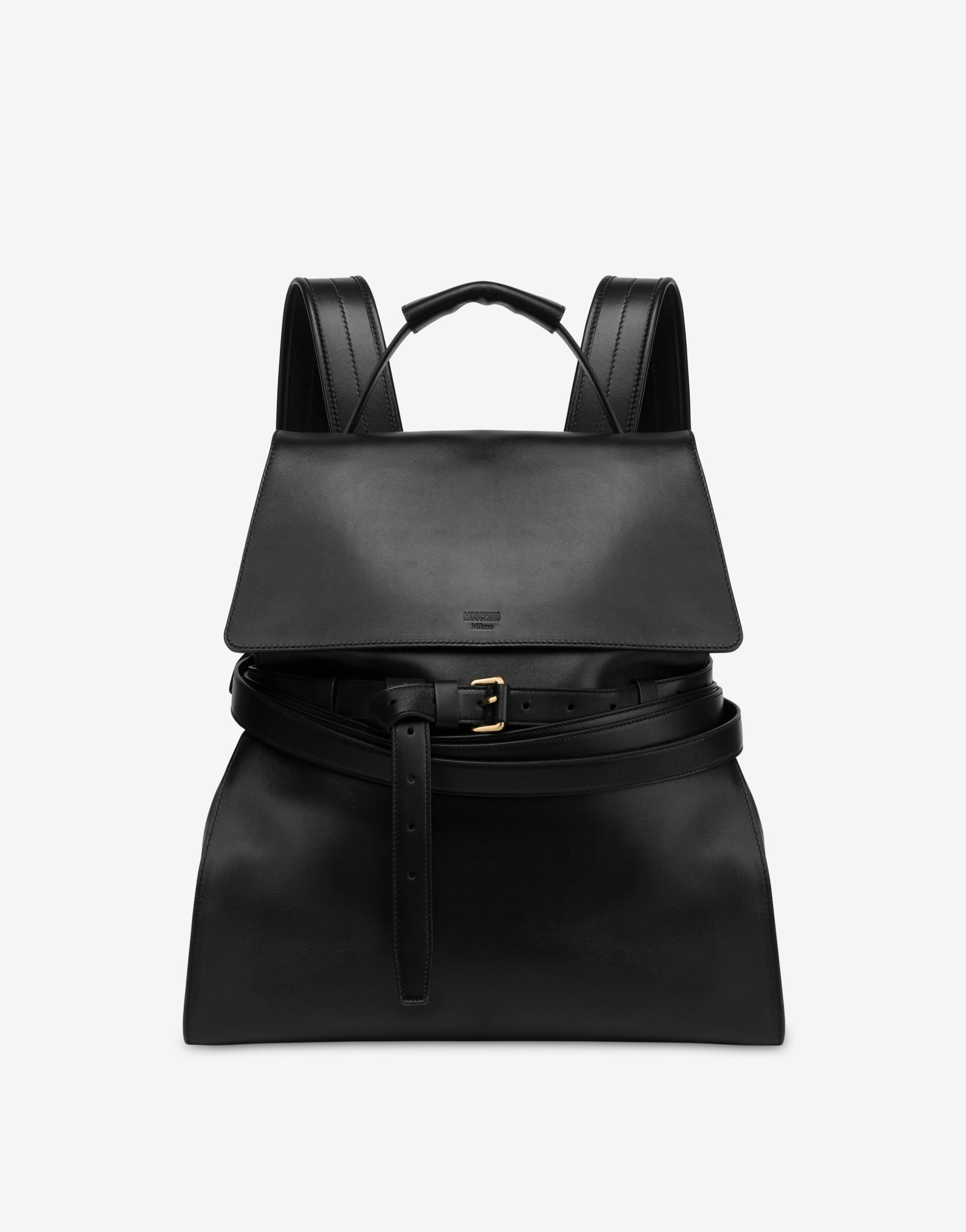 Mochila de piel de napa de gran tamaño y construcción deliberadamente suave. Un rasgo distintivo es el cinturón decorativo completamente extraíble que abraza el cuerpo de la mochila.