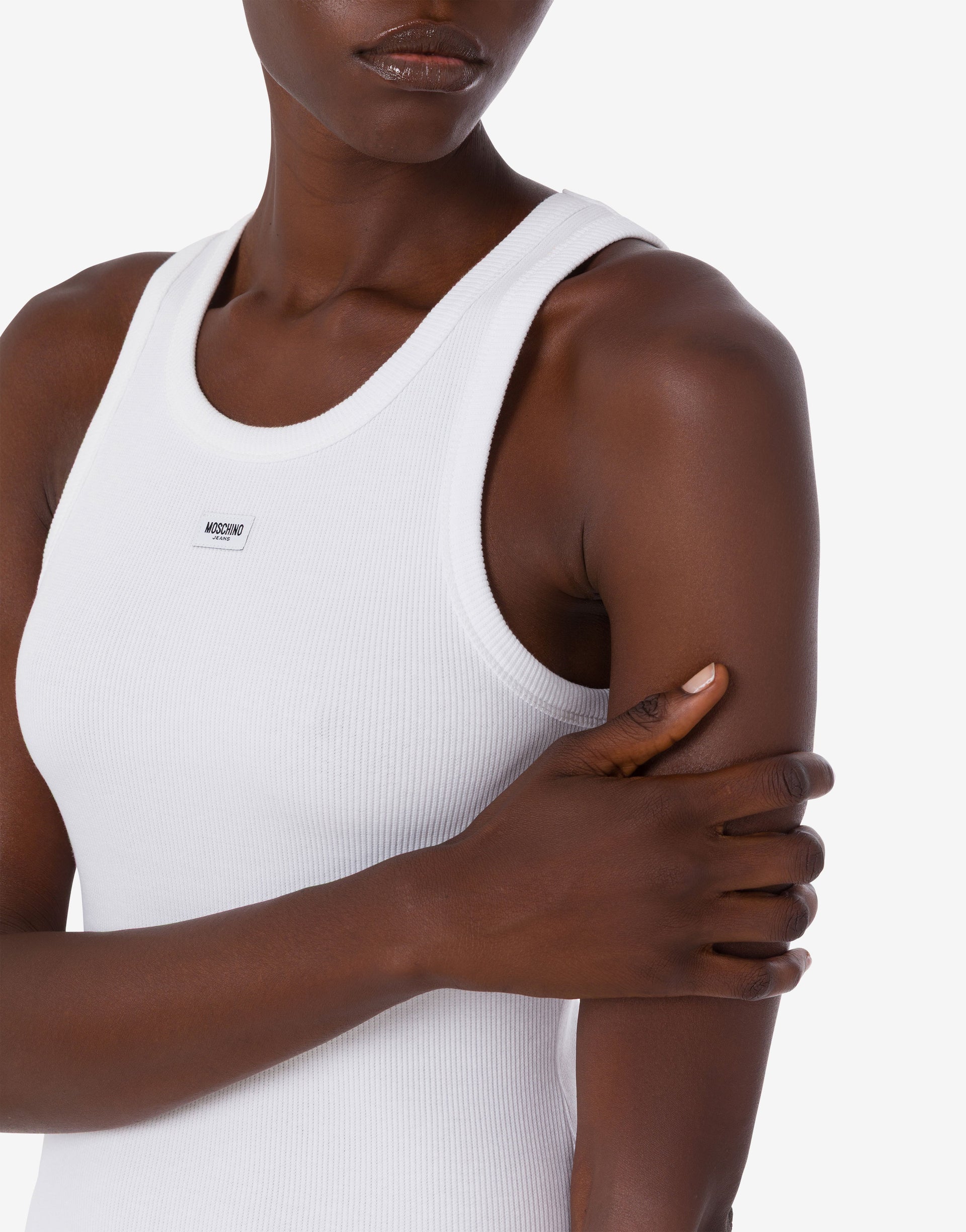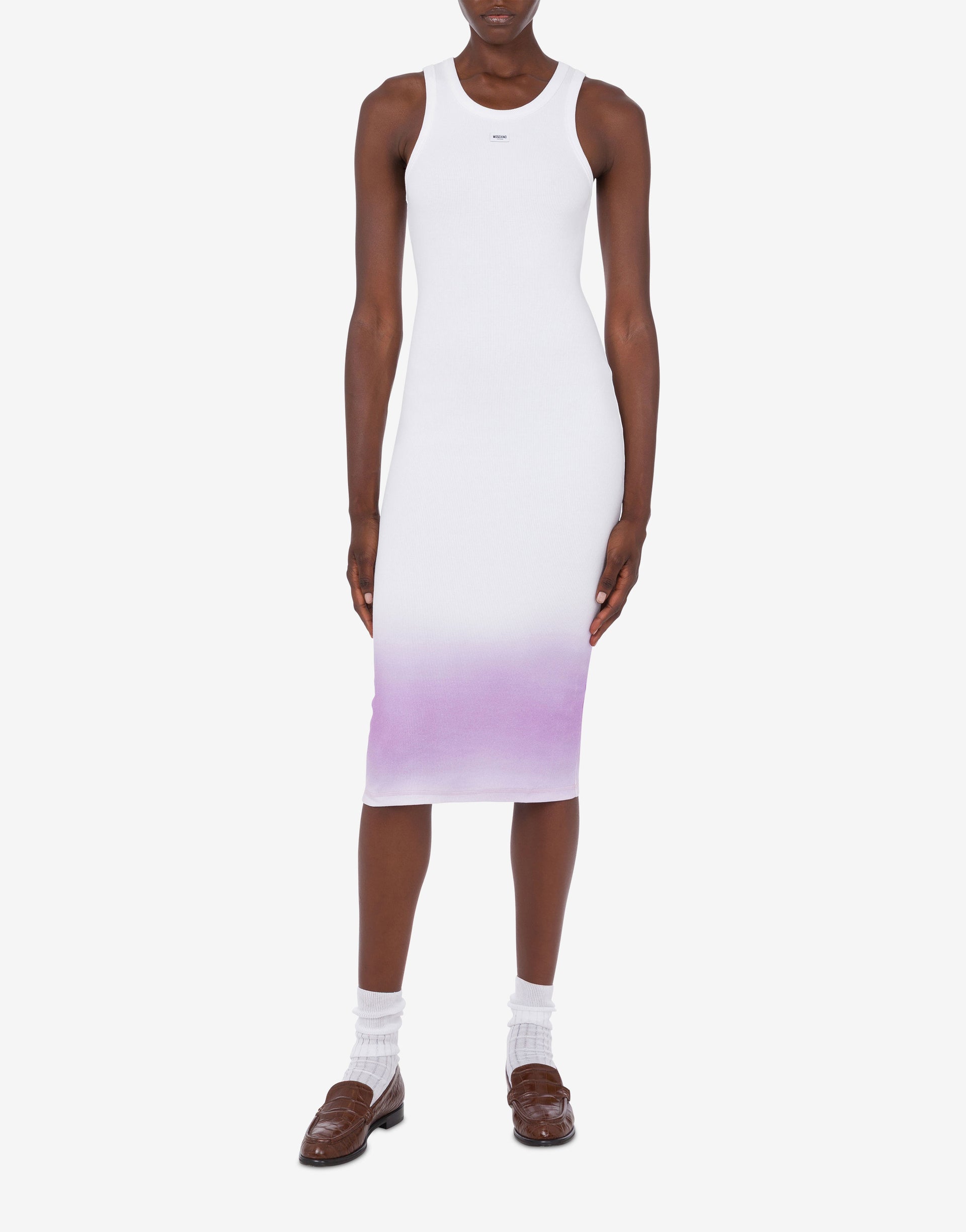 La colección Primavera/Verano 2026 presenta un vestido largo de algodón elástico con un pequeño parche con el logotipo en la parte delantera y un degradado en contraste en la parte inferior.