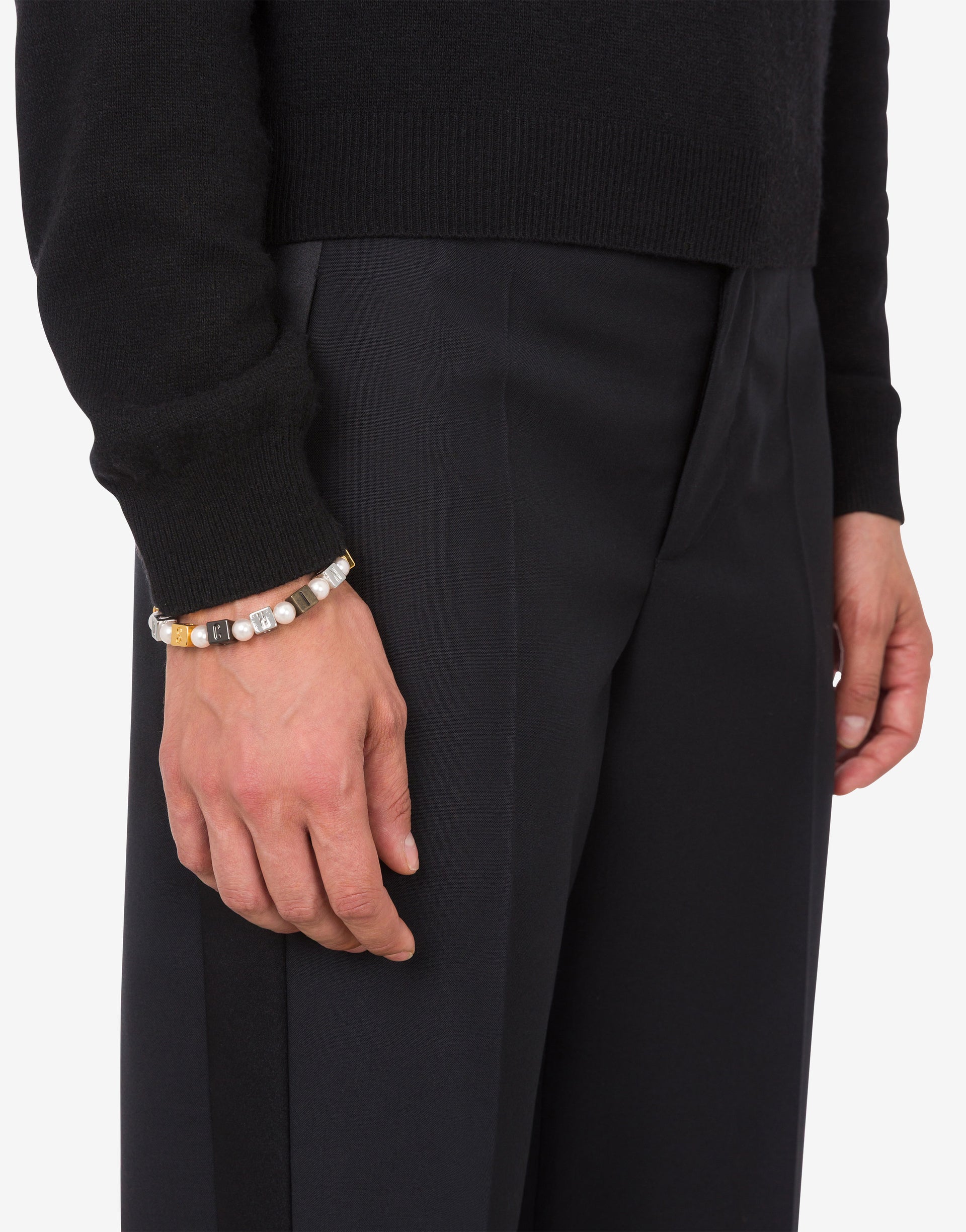 The Resort 2026 collection features a bracelet made with pearls and metal cubes engraved with letters that form the logo.