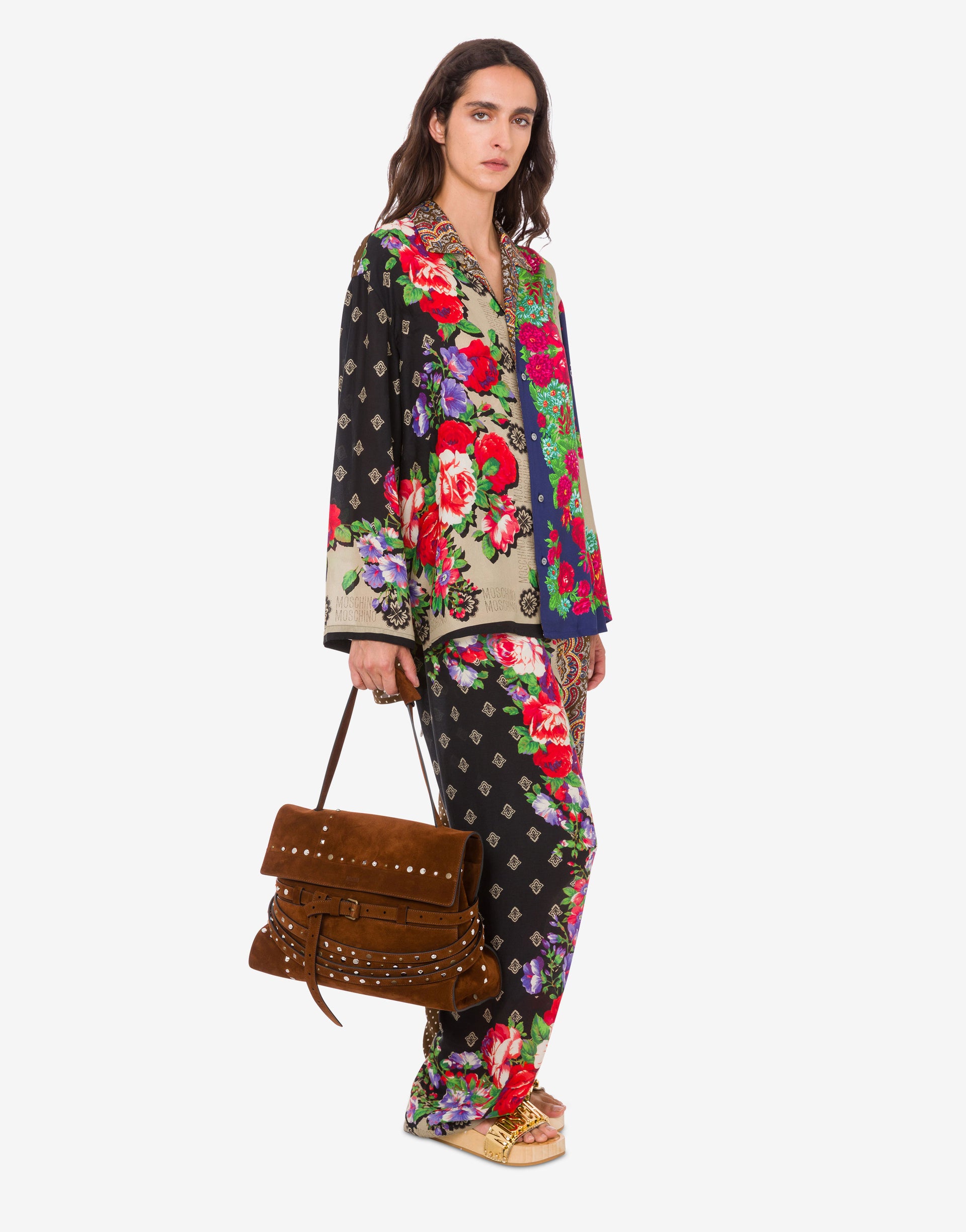 The Resort 2026 collection presents the medium shoulder bag made of suede patchwork and decorated with metal studs. A distinctive feature is the decorative, fully removable belt that hugs the body of the bag.