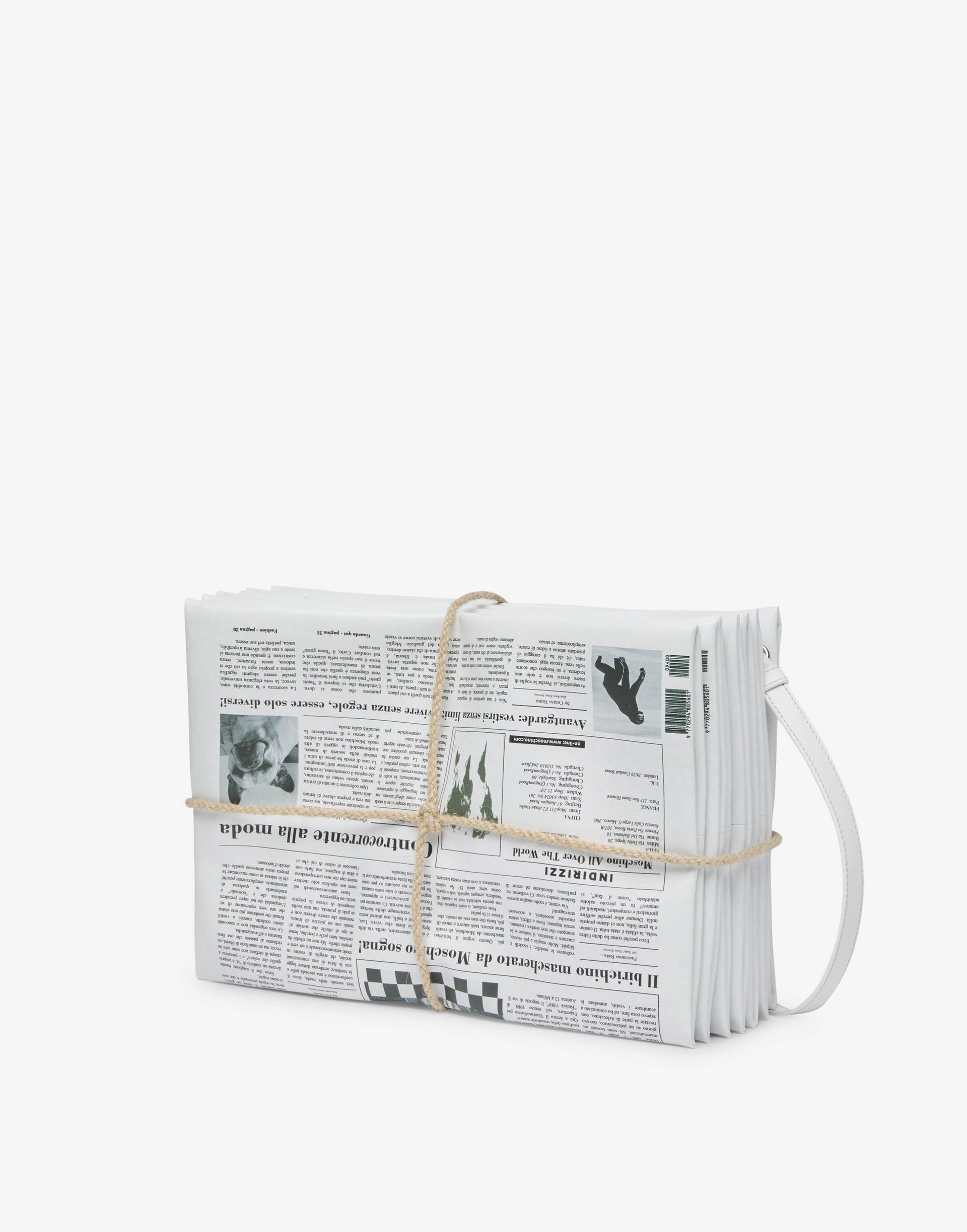 The Spring/Summer 2026 collection features an oversized bag designed to resemble a bundle of newspapers. Made by layering printed newspapers, sewing them together, and finishing with a knotted rope, the bag combines volume and material research in a distinctive aesthetic.