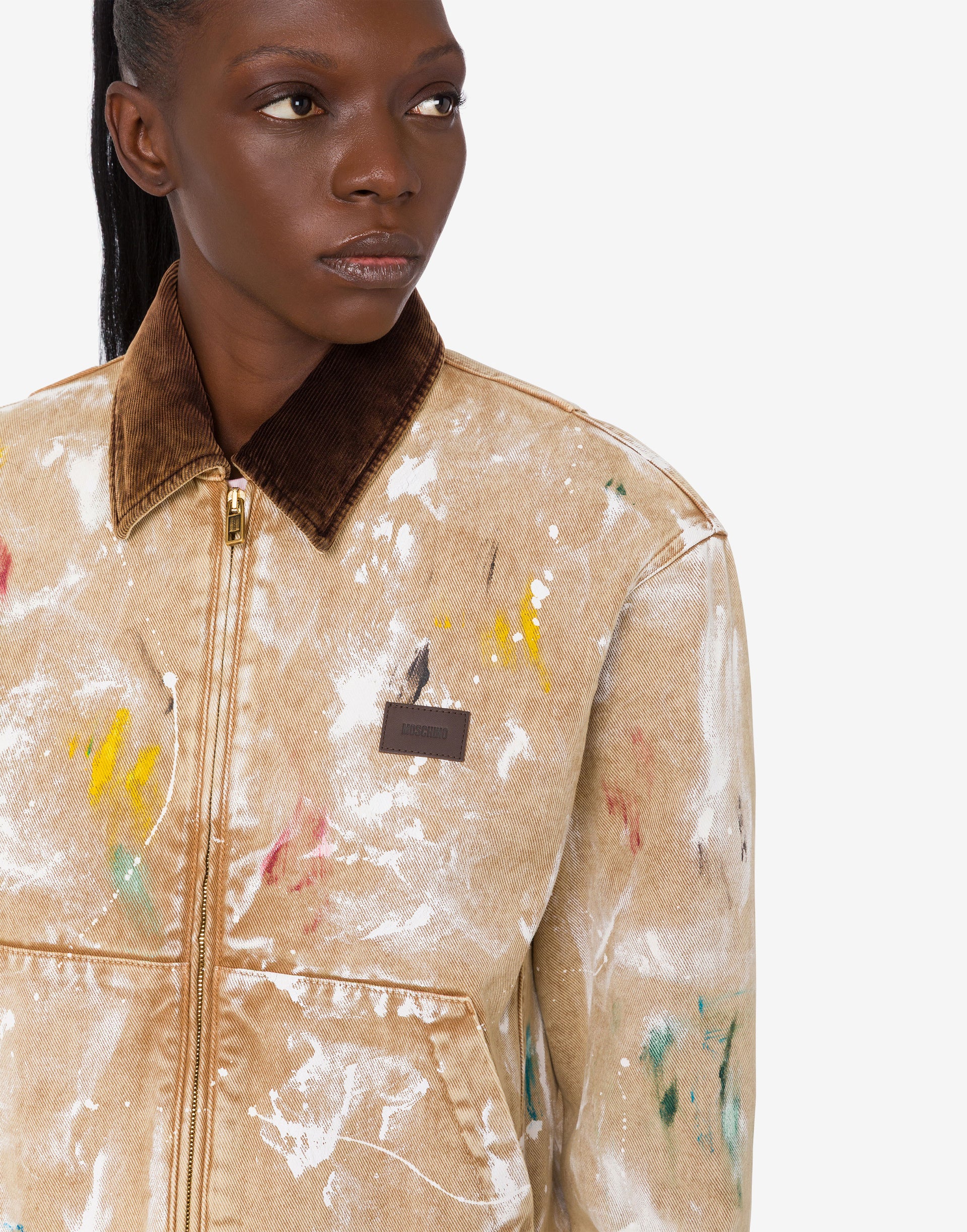 2026 年度假系列推出的棉质公牛夹克,采用灯芯绒领口和绘画效果印花。