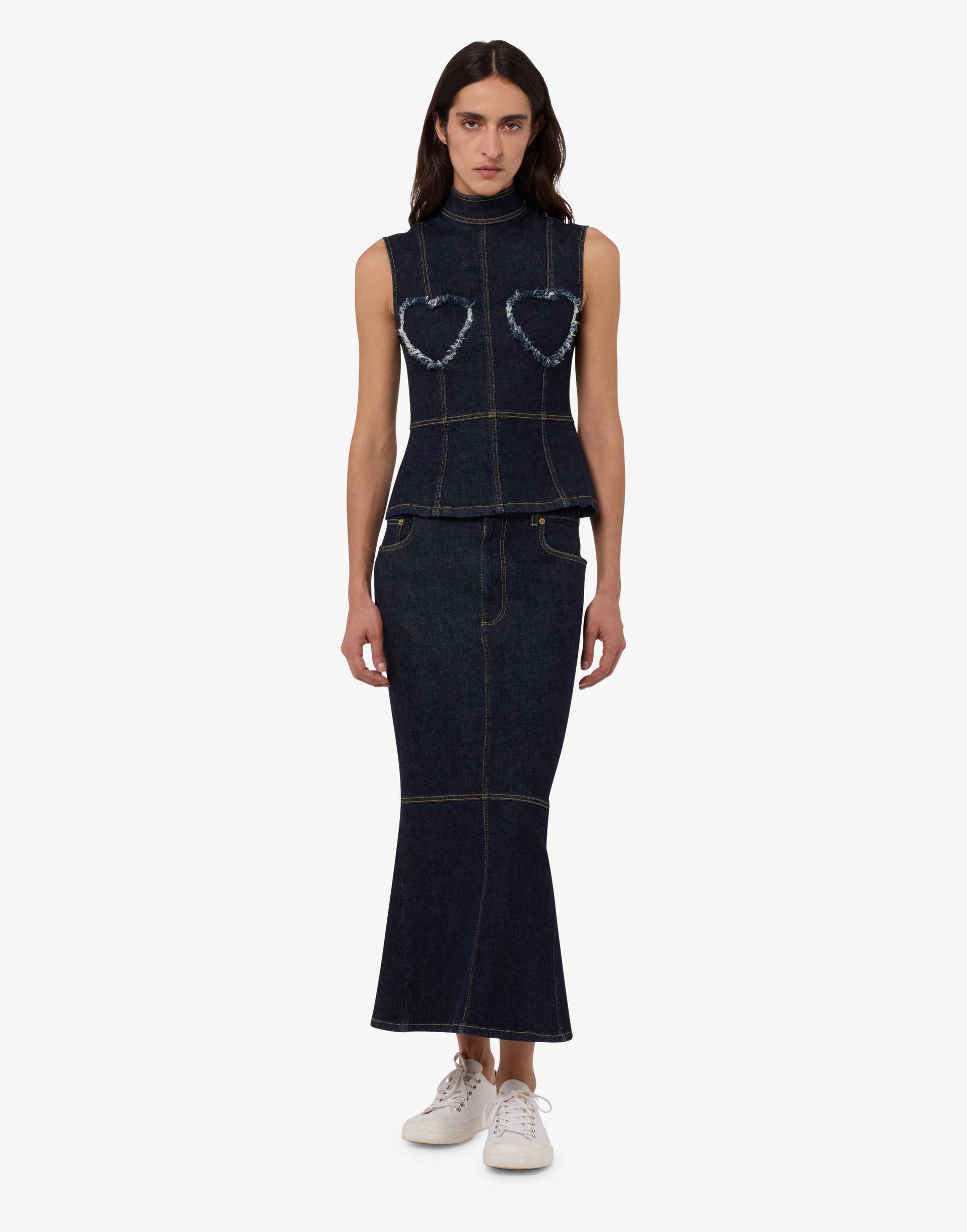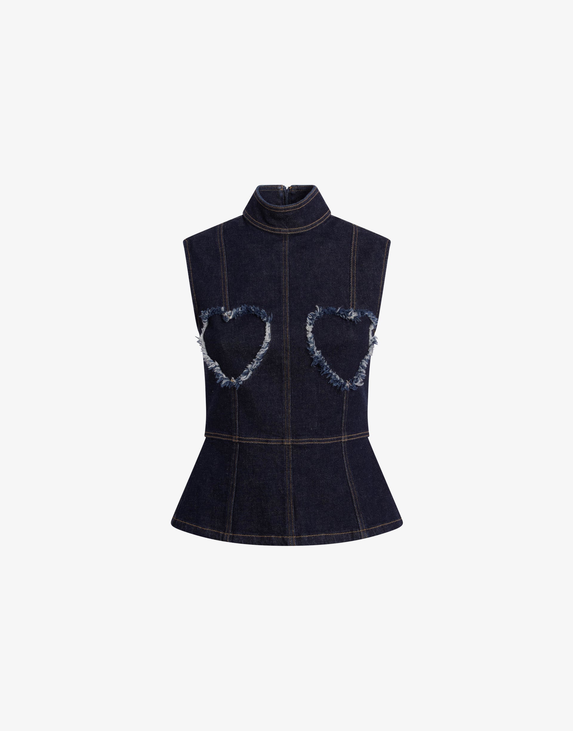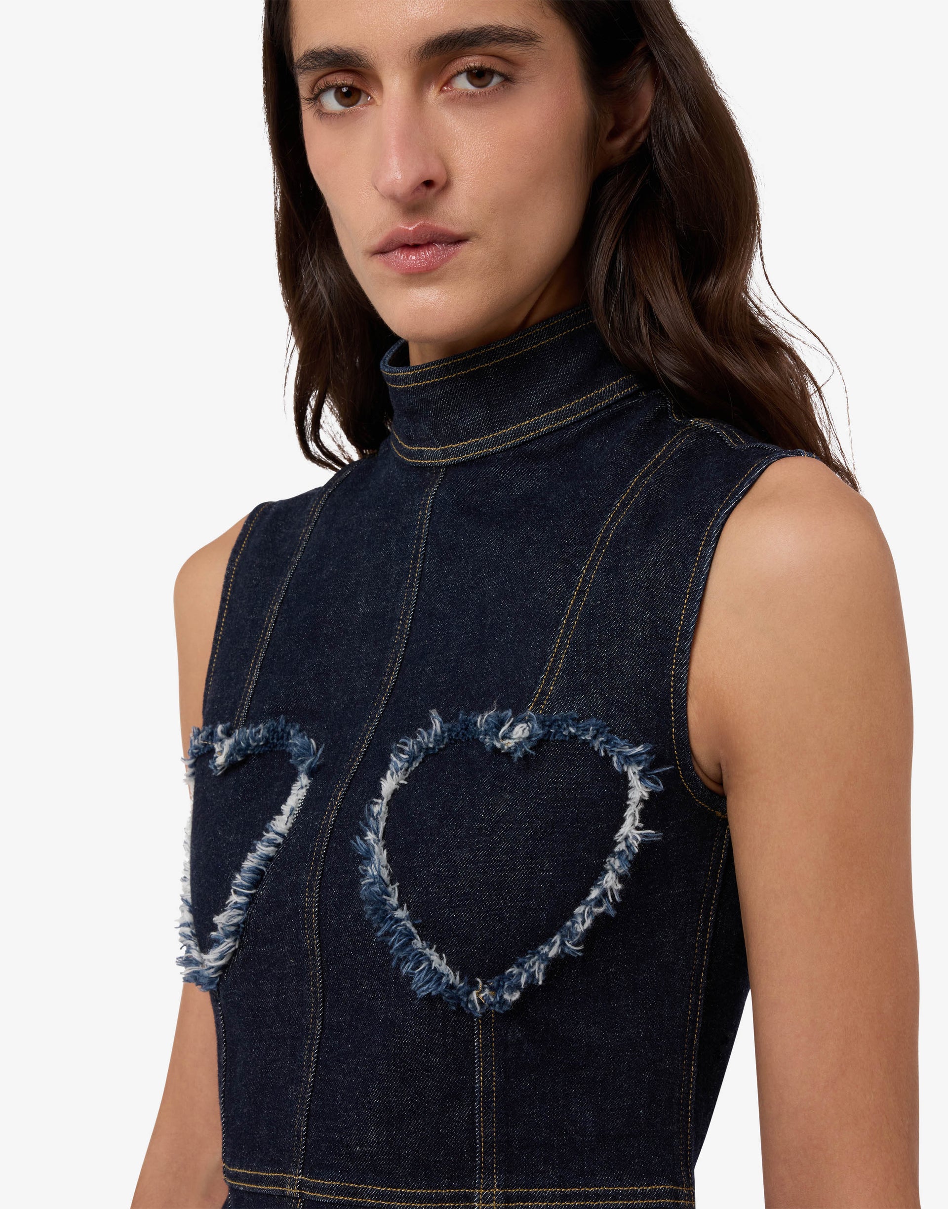 2026春夏系列推出蓝色棉质弹力牛仔上衣,饰有心形镂空流苏与撞色缝线。