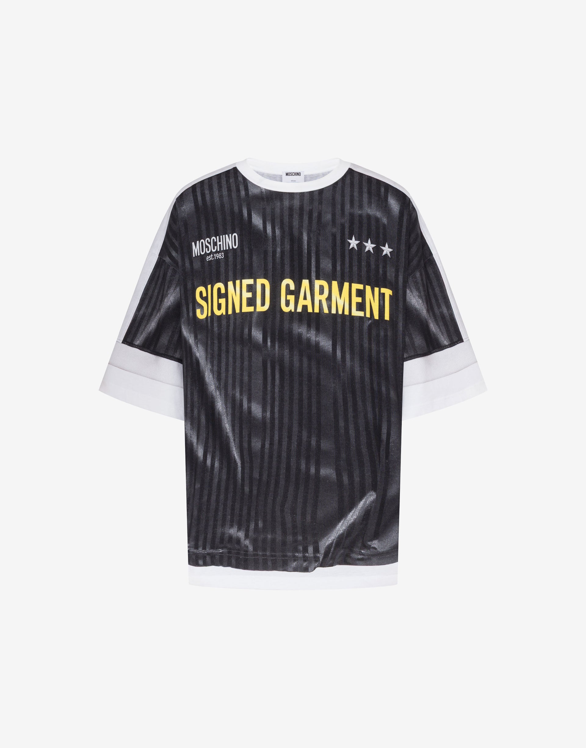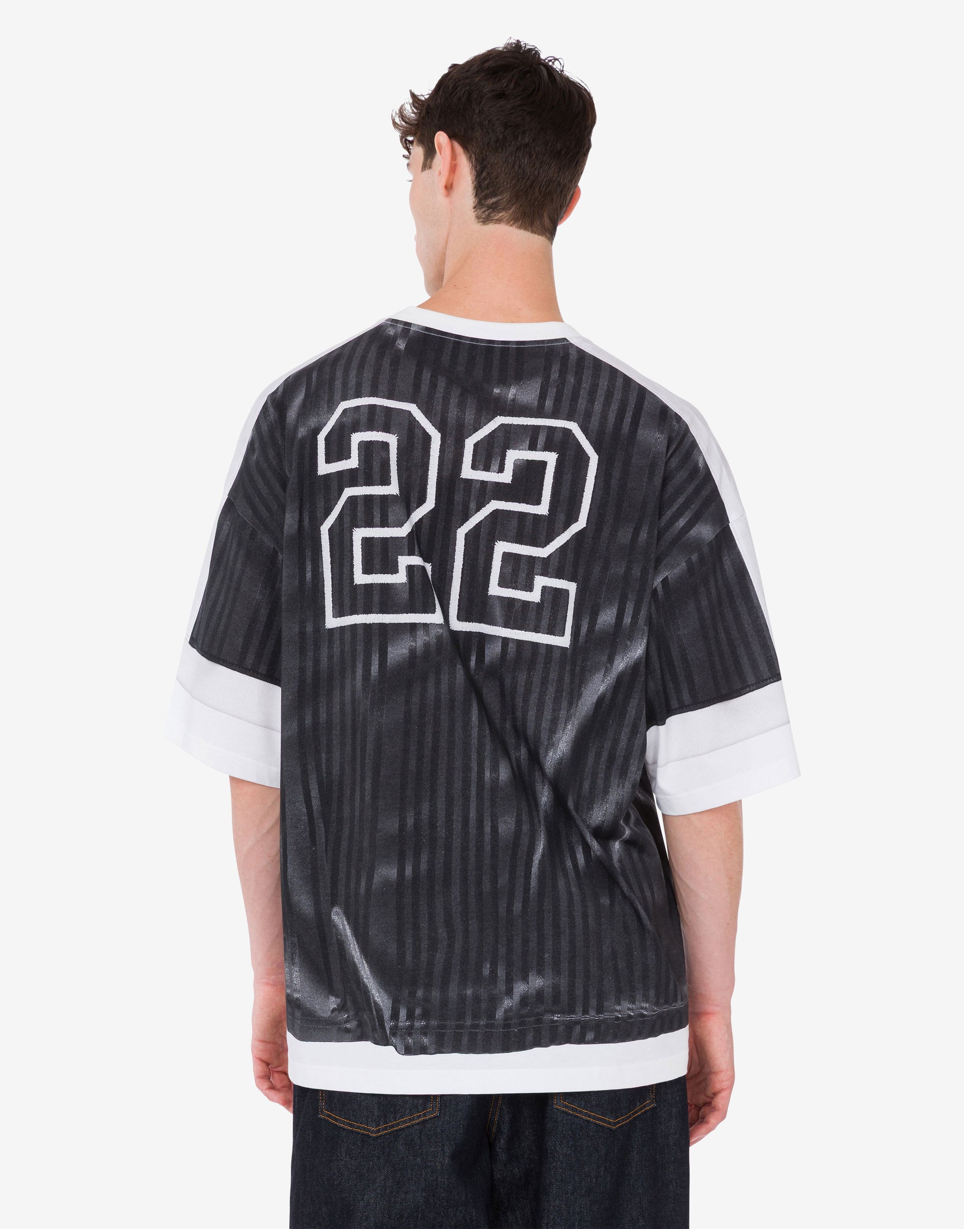 2026春夏系列推出有机棉针织T恤,饰有足球队T恤风格的错视效果印花。