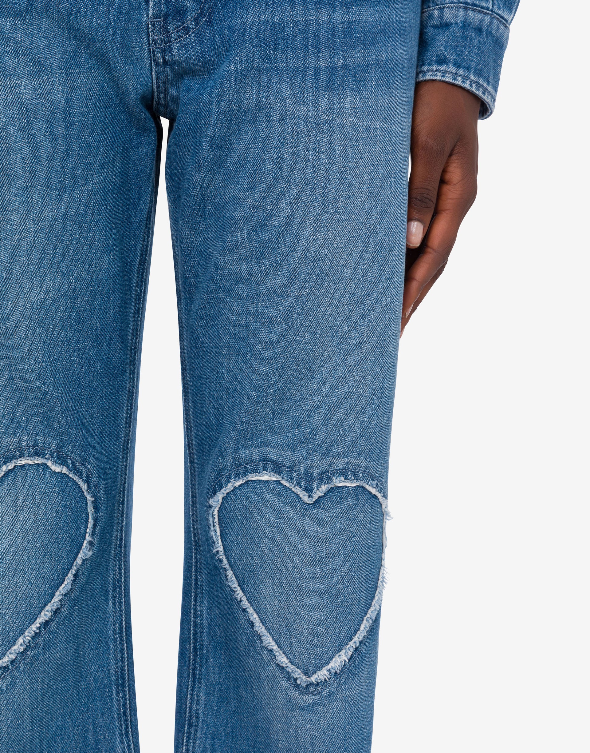 2026 年度假系列推出五袋裤,采用蓝色棉质牛仔布料,心形细节边缘磨边。