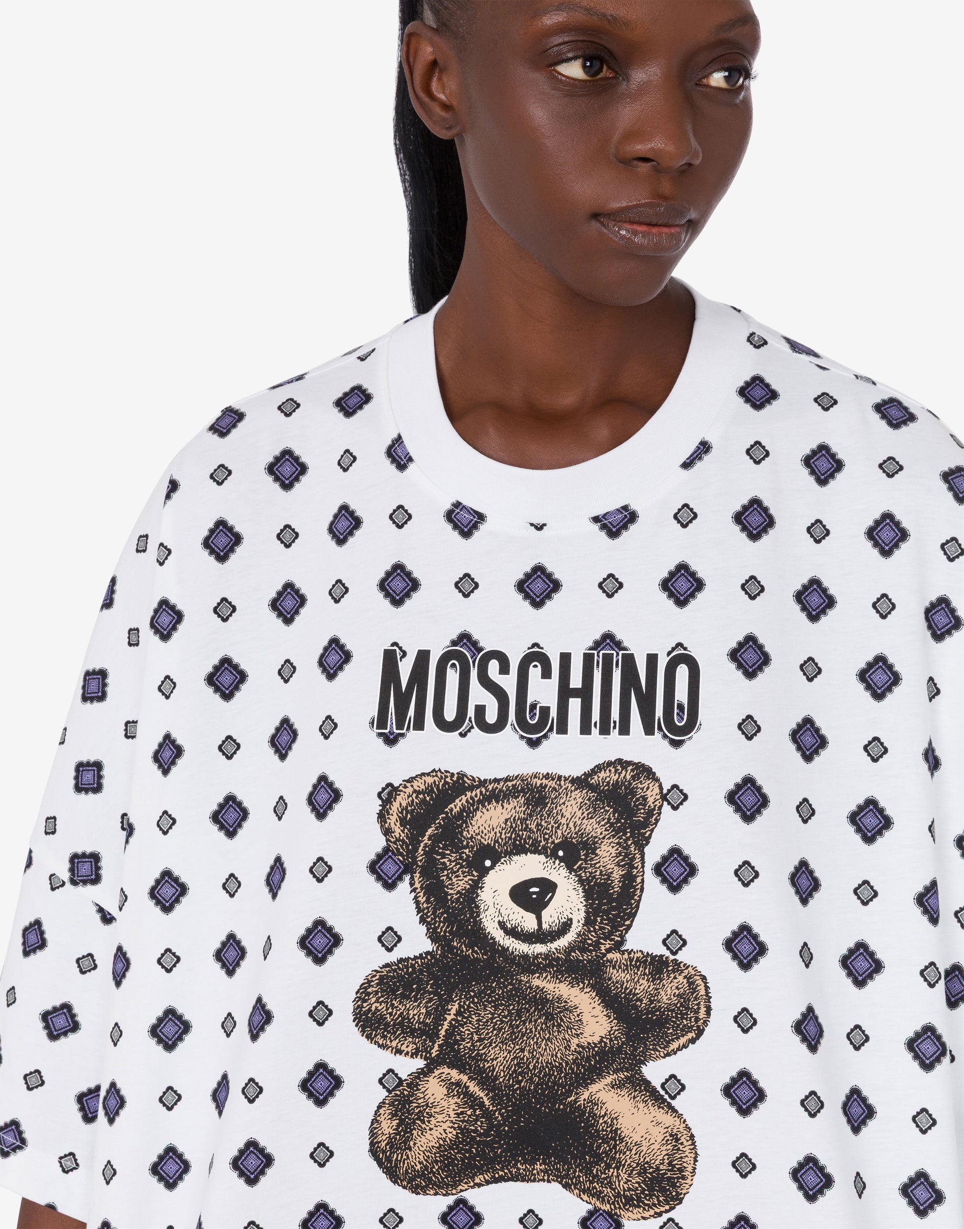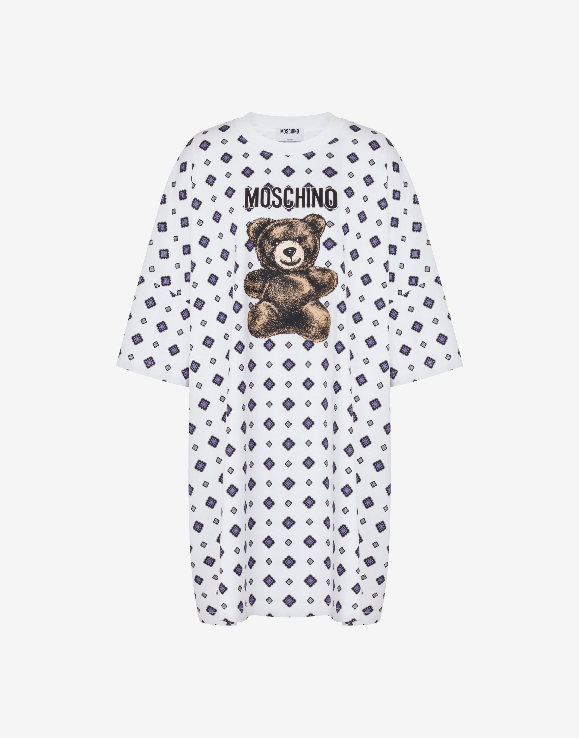 2026 年度假系列推出的有机棉针织连衣裙,正面印有 Moschino 泰迪熊图案。