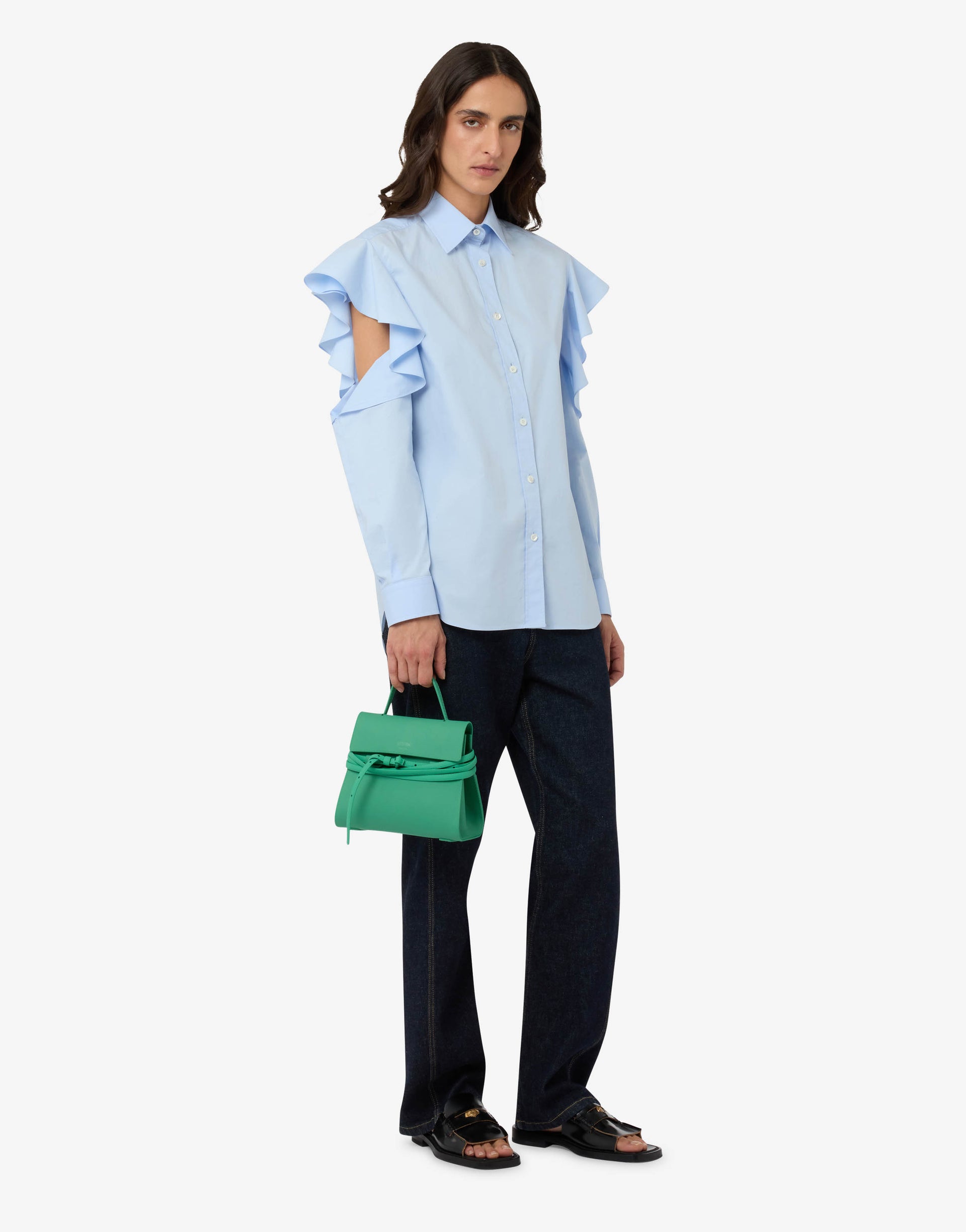 2026春夏系列推出哑光硅胶小手袋,采用无缝设计。这款手袋在每个细节上都复刻了传统Tie Me包的美学精髓,在技术与生产层面实现了大胆创新。其标志性特征是环绕包身的装饰性腰带,可完全拆卸。